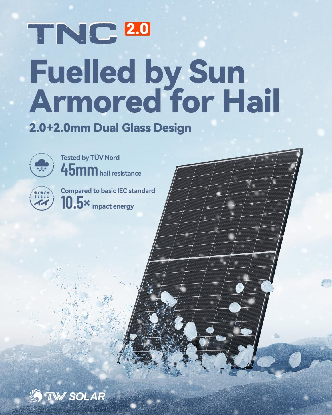 The TNC 2.0 G12R-48 module was specifically designed to address these challenges. With its dual-glass design and 2.0mm heat-strengthened glass, the module offers outstanding resistance to wind and hail.